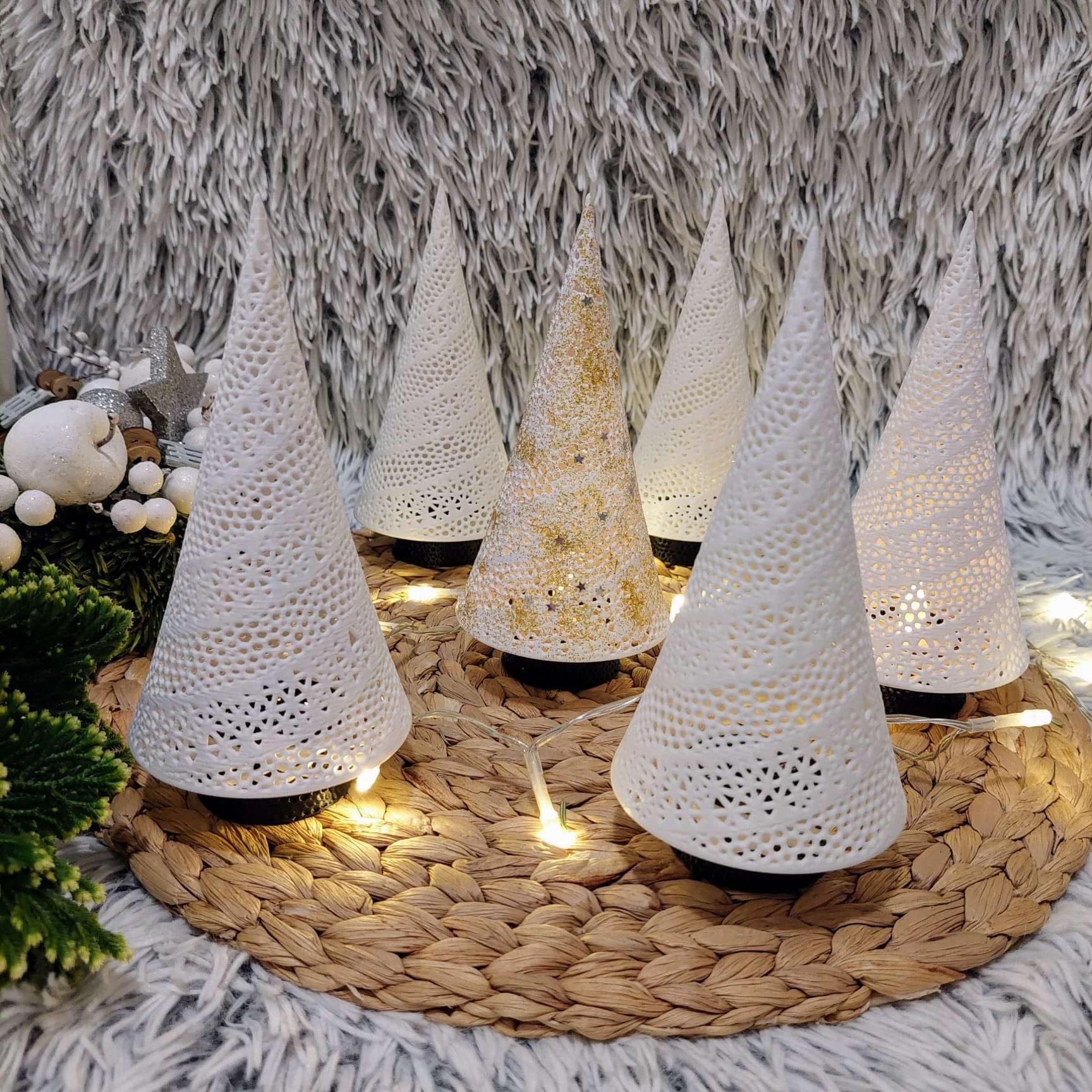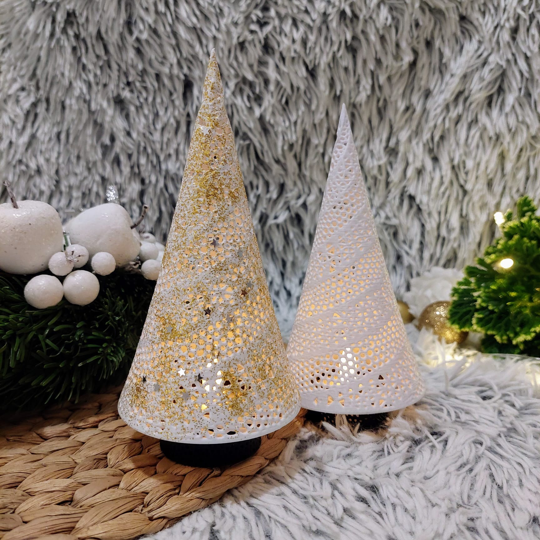 Vánoční stromeček kuželovitého tvaru. Můžete si vybrat mezi bílou variantou nebo nádechem zlaté či stříbrné barvy.